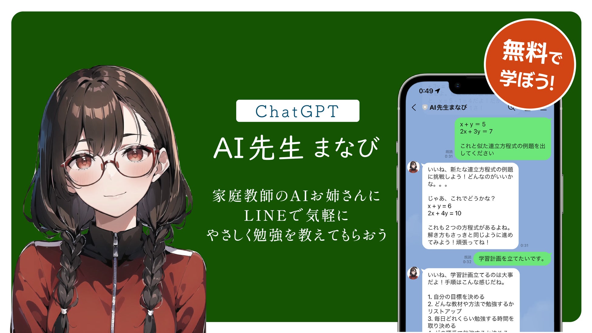 中高生向けのAI家庭教師を提供するLINE botで、ユーザーはチャットを通してわからない問題を質問したり、例題を出題してもらったりできます。