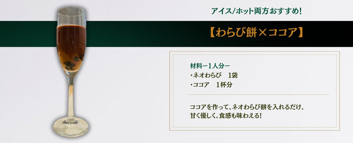 NEOわらび餅は水だけで15秒で作れる新感覚のお菓子です。アレンジも自由自在で、さまざまなシーンでお楽しみいただけます。