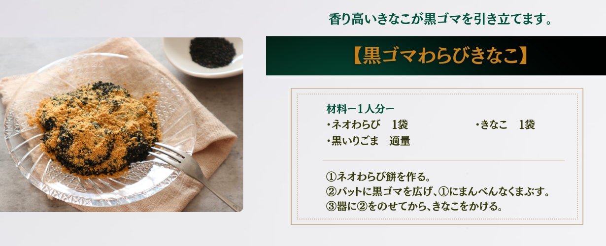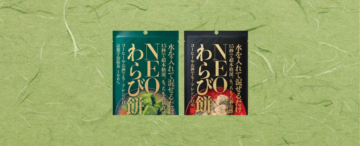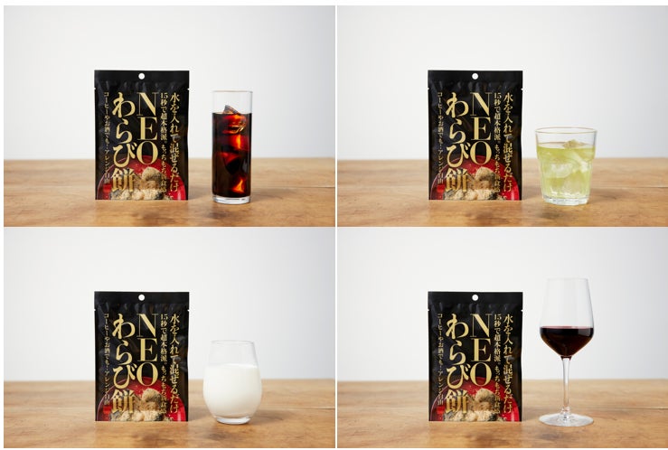 「15秒で美味しく、楽しく作れる」というところにこだわりました。 通常のわらび餅はわらび粉、砂糖、水の3つを合わせて火にかけ30分以上混ぜ続け冷やす必要がありますが、もう少し手軽に家でわらび餅が作れないか、と考え開発に至りました。わらび餅のもちもち食感が出るようにわらび餅粉、水、炭顆粒の配合量を調整し絶妙なバランスで完成しました。 添付されている抹茶にも実はとてもこだわり、各メーカーの商品を取り寄せ、1キロ以上は試食したと思います(笑)やっとNEOわらび餅に合う抹茶が見つかり、今回のNEOわらび餅が完成しました。
