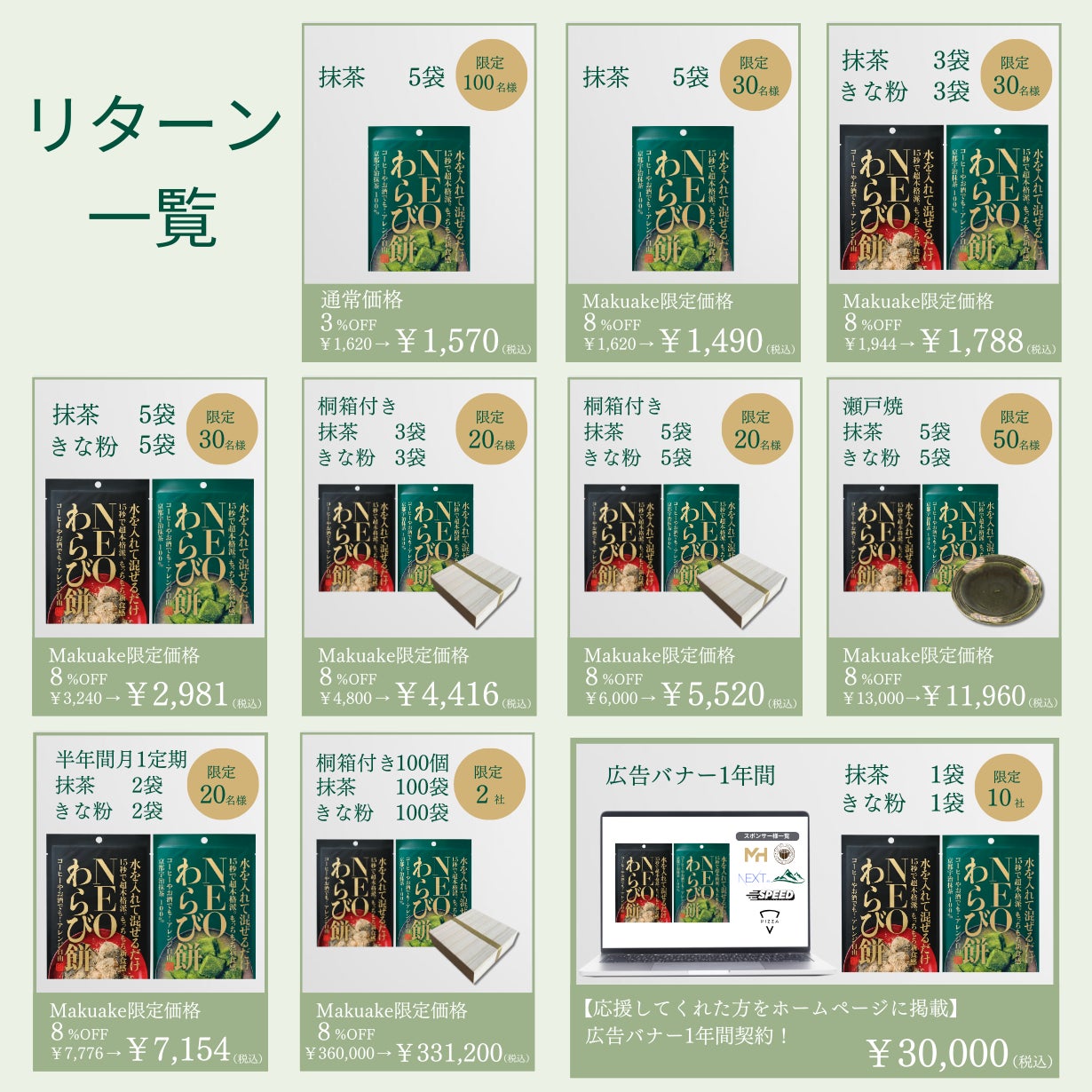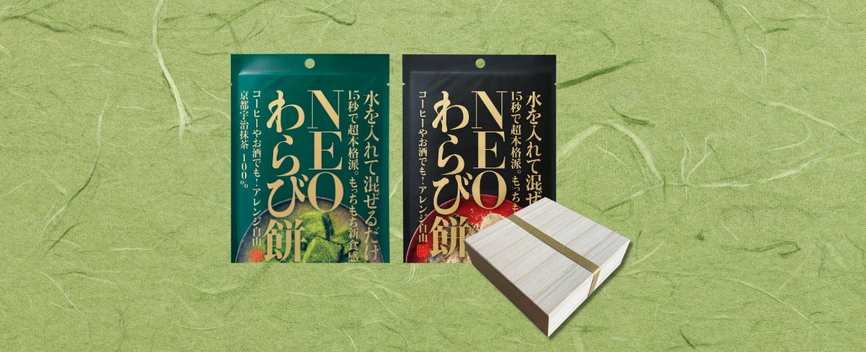 リターン品でお届けする商品は、NEOわらび餅【抹茶味】と発売中の【きな粉味】をセットにしたものをご用意いたしました。