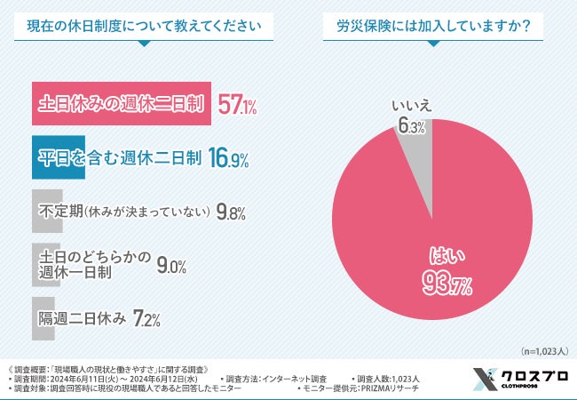 約6割が土日休みの週休二日制、約9割が労災保険に加入している