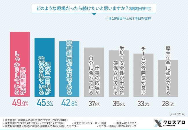 最後に、「どのような現場だったら続けたいと思いますか?(複数回答可)」と質問したところ、『昇給制度がしっかりしている(49.9%)』と回答した方が最も多く、『週休二日制が確保されている(45.3%)』『評価制度が公正である(42.8%)』と続きました。