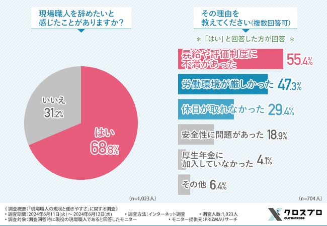 約7割が現場職人を辞めたいと思った経験があることが明らかになり、半数以上が昇給や評価制度に対する不満を挙げています。