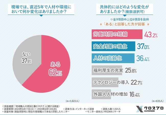 【現場職人の現状と働きやすさに関する調査】近年の変化で感じることは「労働時間の短縮」や「人材の高齢化」