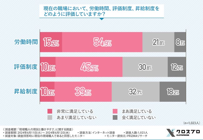 約7割が労働時間に、約6割が評価制度に満足していることが明らかになりました。一方で、昇給制度の満足度は評価が分かれることが示されました。