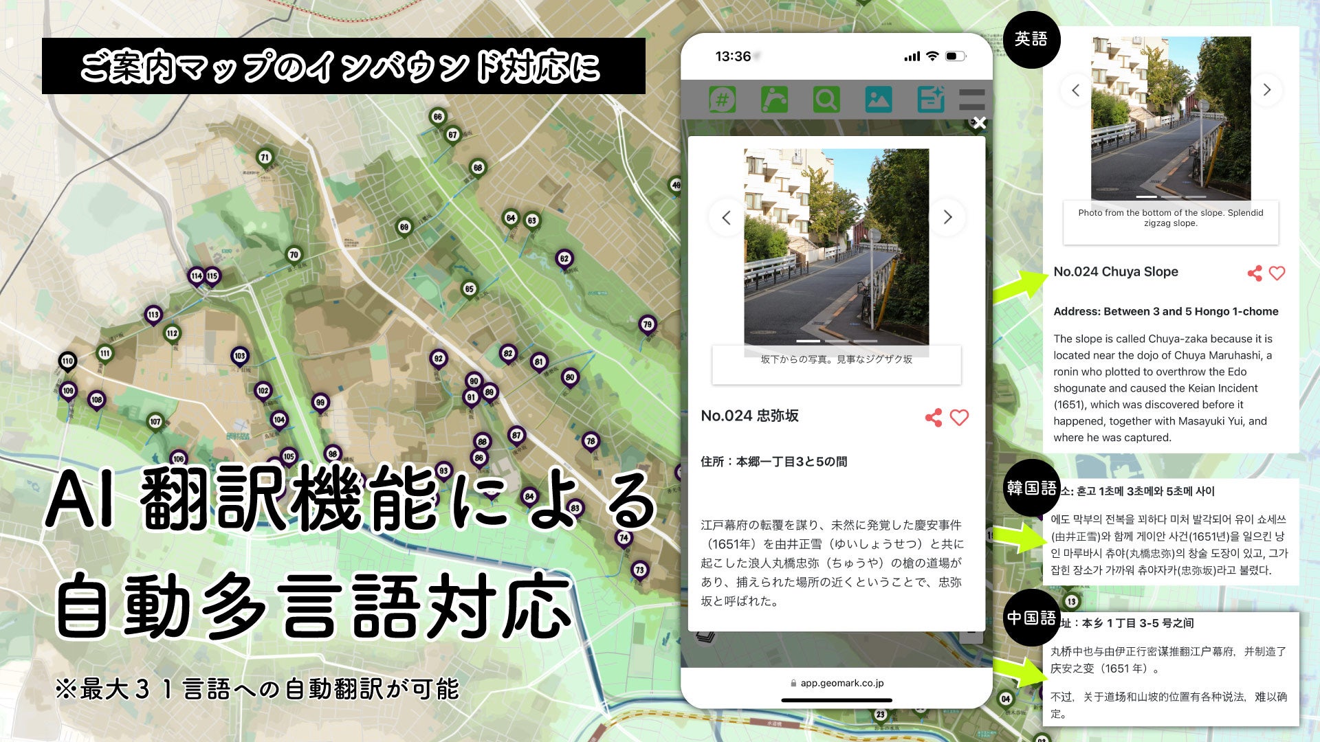 地図で移動と体験を最高に。ジオ・マーク株式会社は、AI翻訳機能を利用した最大31言語への自動翻訳を実現。ご案内マップを手軽に多言語化できるサービスで、インバウンドの受け入れ環境強化を実現します。