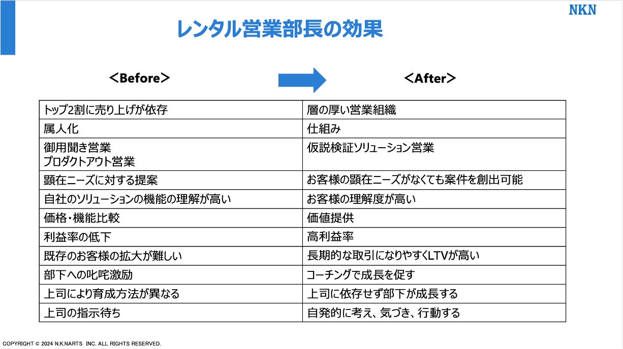 このような問題の根本的な原因として、営業の戦略的な人材育成に対するリソース不足、営業マネージメントとしての営業育成の経験不足が挙げられます。N.K.ナーツ株式会社は、これらの課題を解決するために「レンタル営業部長サービス」を立ち上げました。営業部長として個々の企業の一員として参画し、営業戦略の構築、営業担当者の育成、案件管理、提案力強化を通じて、企業の成長を全面的にサポートします。