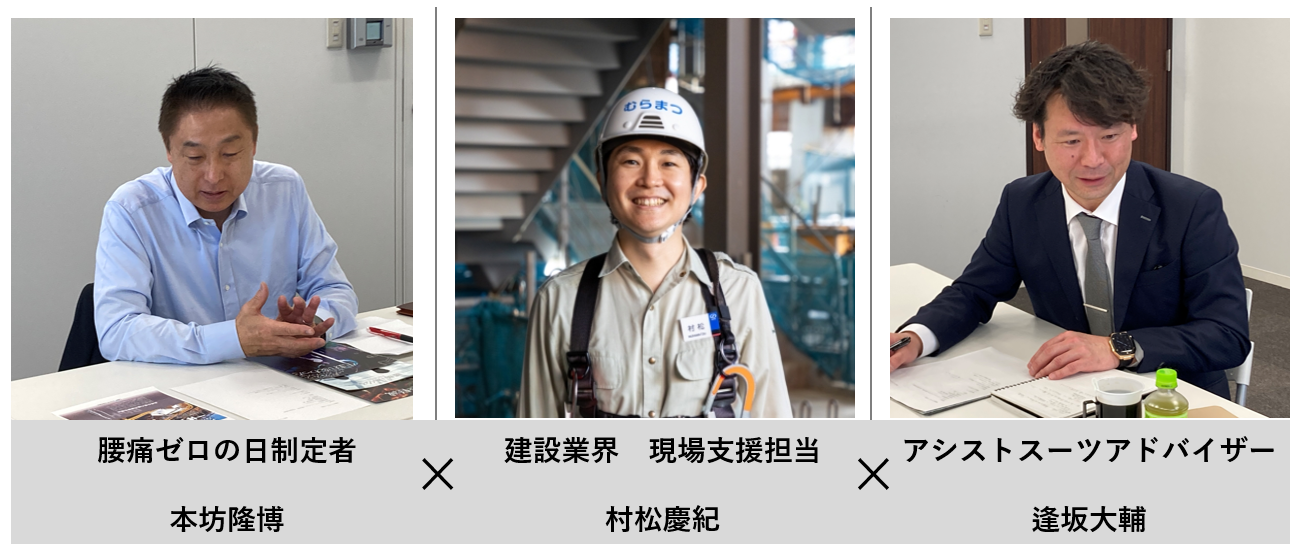 腰痛ゼロの日制定者×建設業界の現場支援担当者×アシストスーツアドバイザーの3者が集まって腰痛ゼロに向けての対談を行いました。