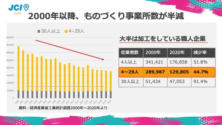 ただ、サプライチェーンは依然として強固な供給責任を持っているため、いたずらな顧客開拓や業界転換は難しいのも現実。新たに設備投資を行おうにも、大手メーカー中心のサプライチェーンだけではその費用を回収できないため、「次の世代に引き継ぐべきではない」という結論に至ってしまうのです。事実、2000年からの20年で加工を主とする職人企業は半減してしまいました。