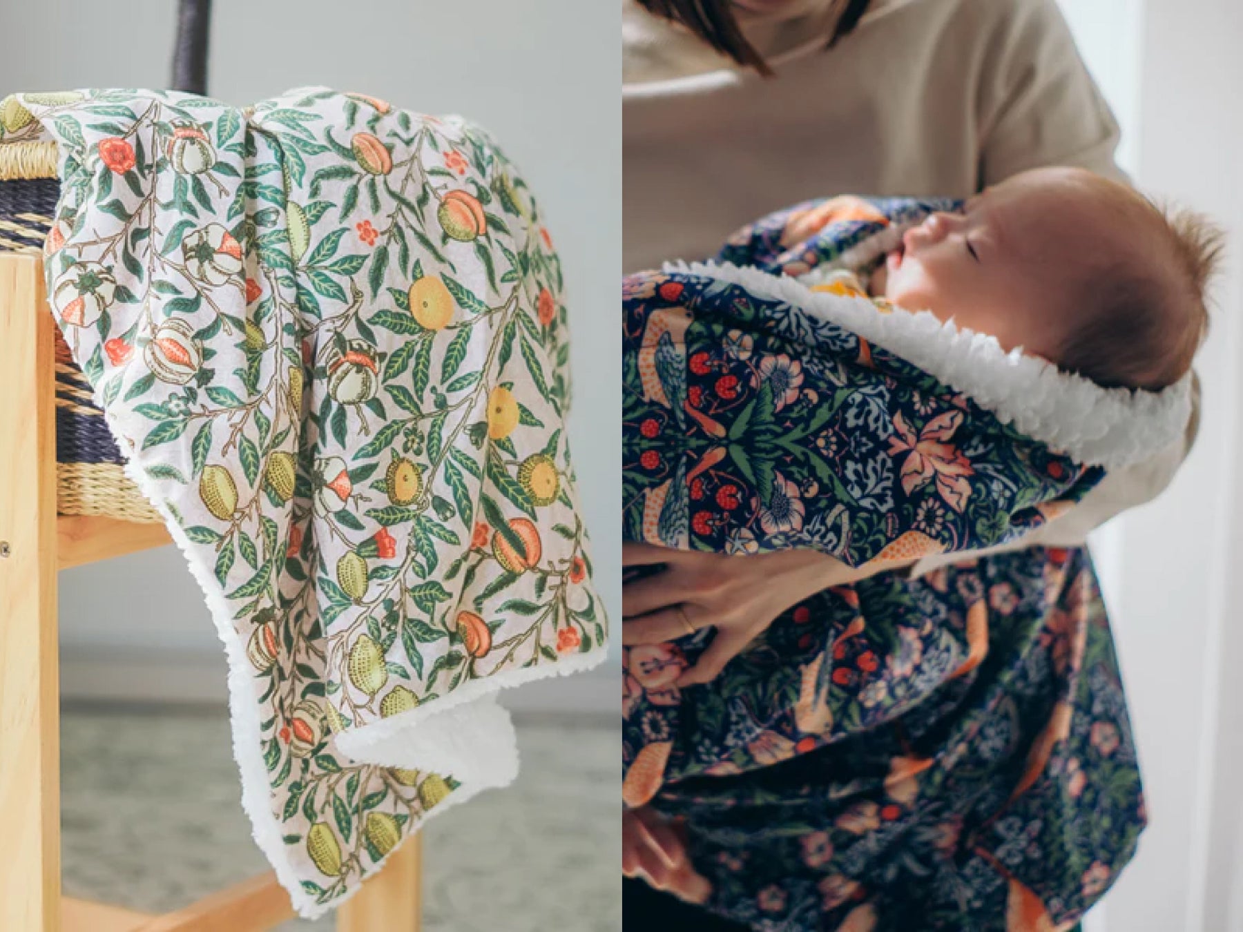 ボアブランケットのサイズは、75cm×120cmです。赤ちゃんや小さなお子様にぴったりのサイズでありながら、大人でもひざ掛けとして使用できる絶妙なサイズ感です。軽量で持ち運びが簡単なので、お出かけ先でもお家でも使いやすく、ソファや椅子に座るときにも大活躍します。ウィリアム・モリスの美しい自然をモチーフとしたデザインで、大人もリラックスしたひとときを楽しむことができます。