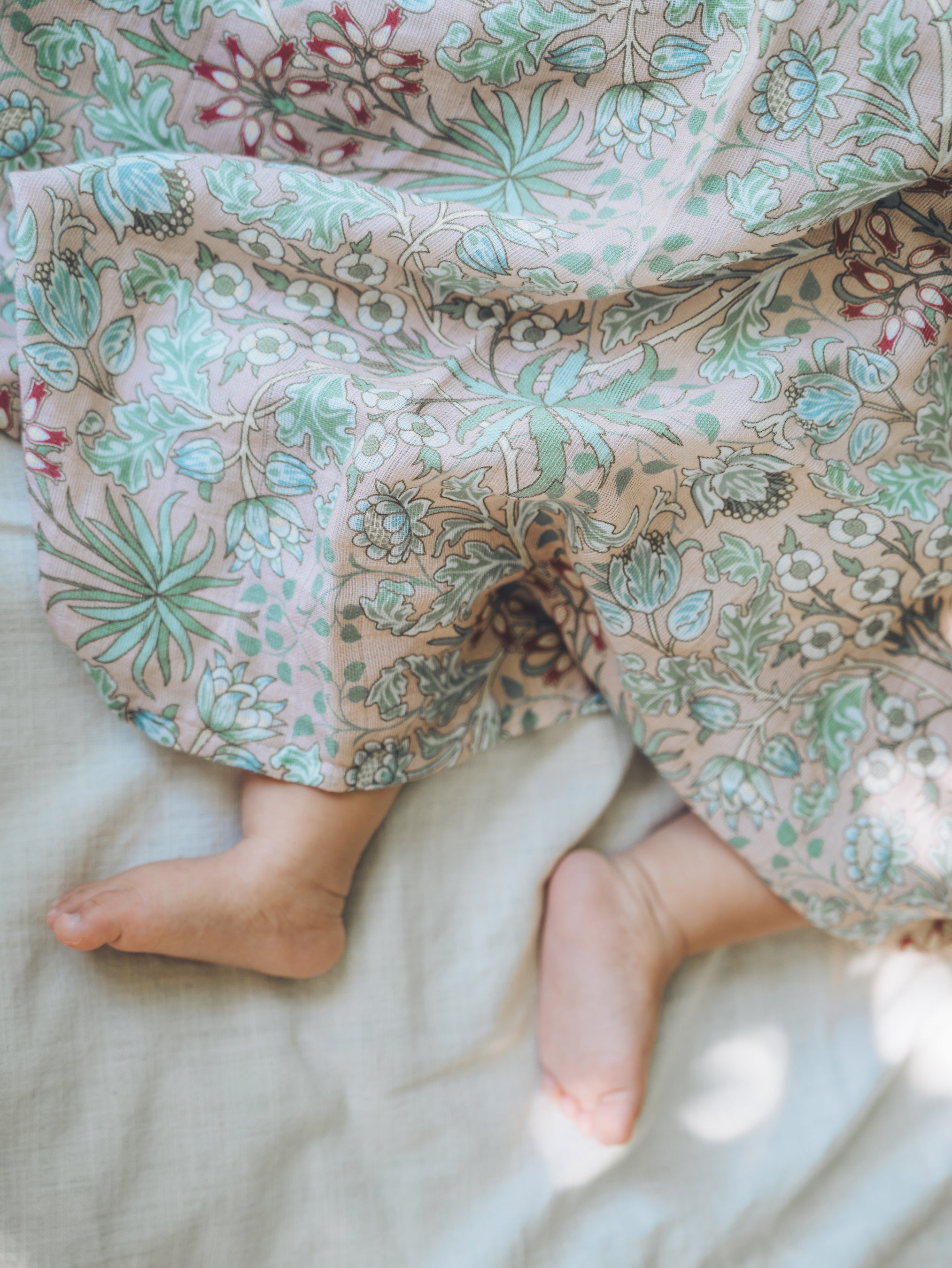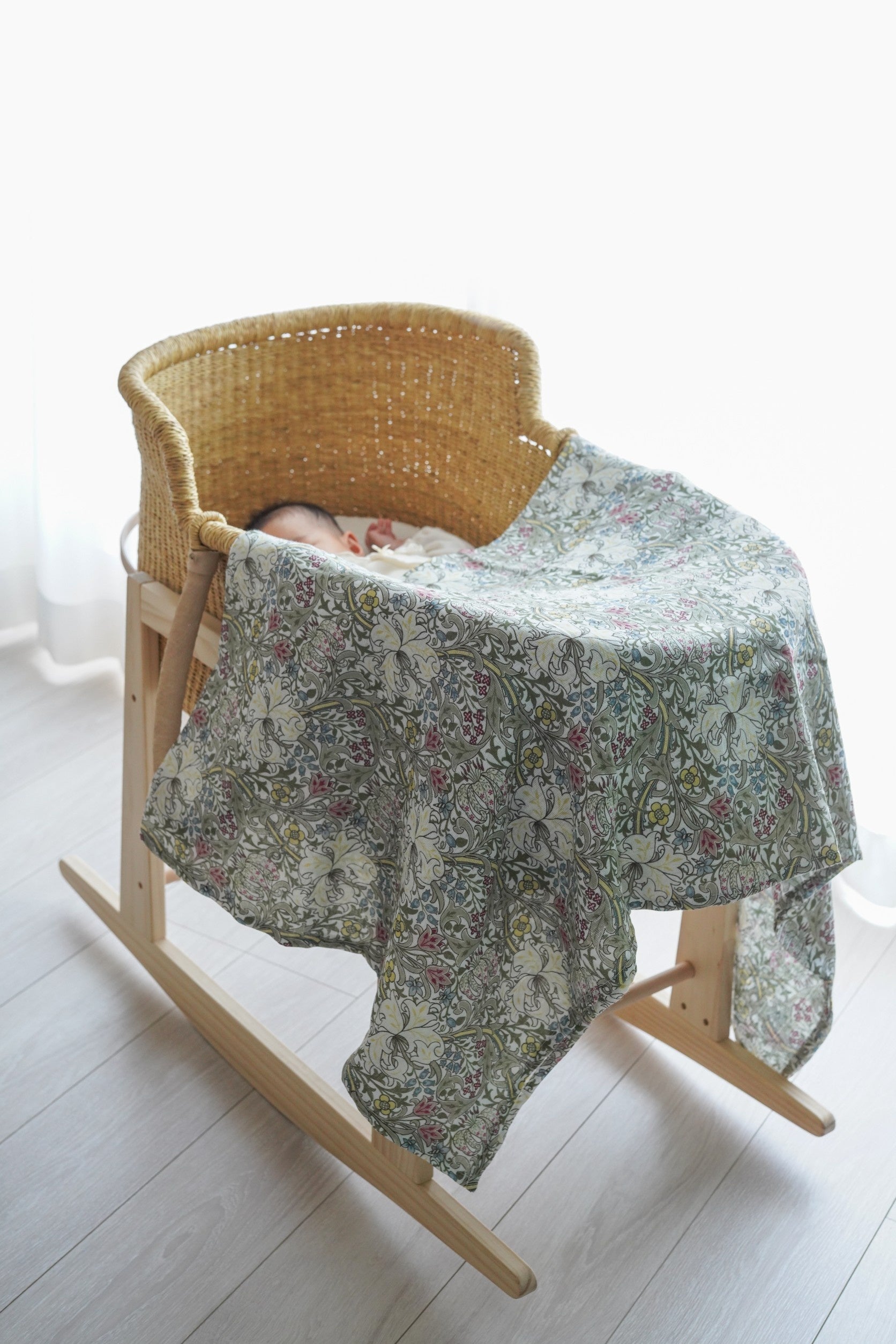 出産のお祝いに人気のウィリアムモリス柄、「ピンパーネル」や「いちご泥棒」「フルーツ」「ウィローボウ」「ウィンドラッシュ」「ゴールデンリリー」、今冬の新作柄の「マリーゴールド」「ローズ&バード」などの12種類とオリジナル柄12種類の全24種類の花束スワドル(おくるみ)を販売しています。(2024年12月現在)