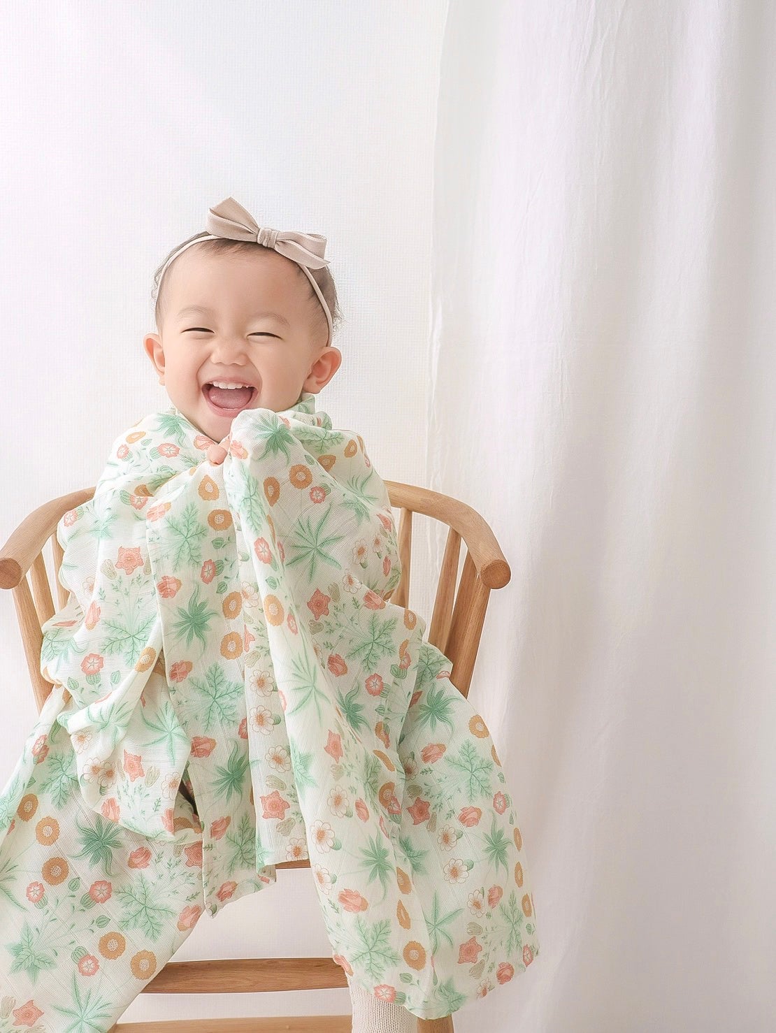 花束スワドル(おくるみ)のサイズは、大きな120cmの正方形です。素材は、柔らかく通気性が高いモスリンコットン100%の生地を使用しています。ネットに入れれば洗濯機で洗浄が可能です。使うほどに柔らかさが増し、ふわふわな触り心地になります。赤ちゃんの肌に優しくフィットします。