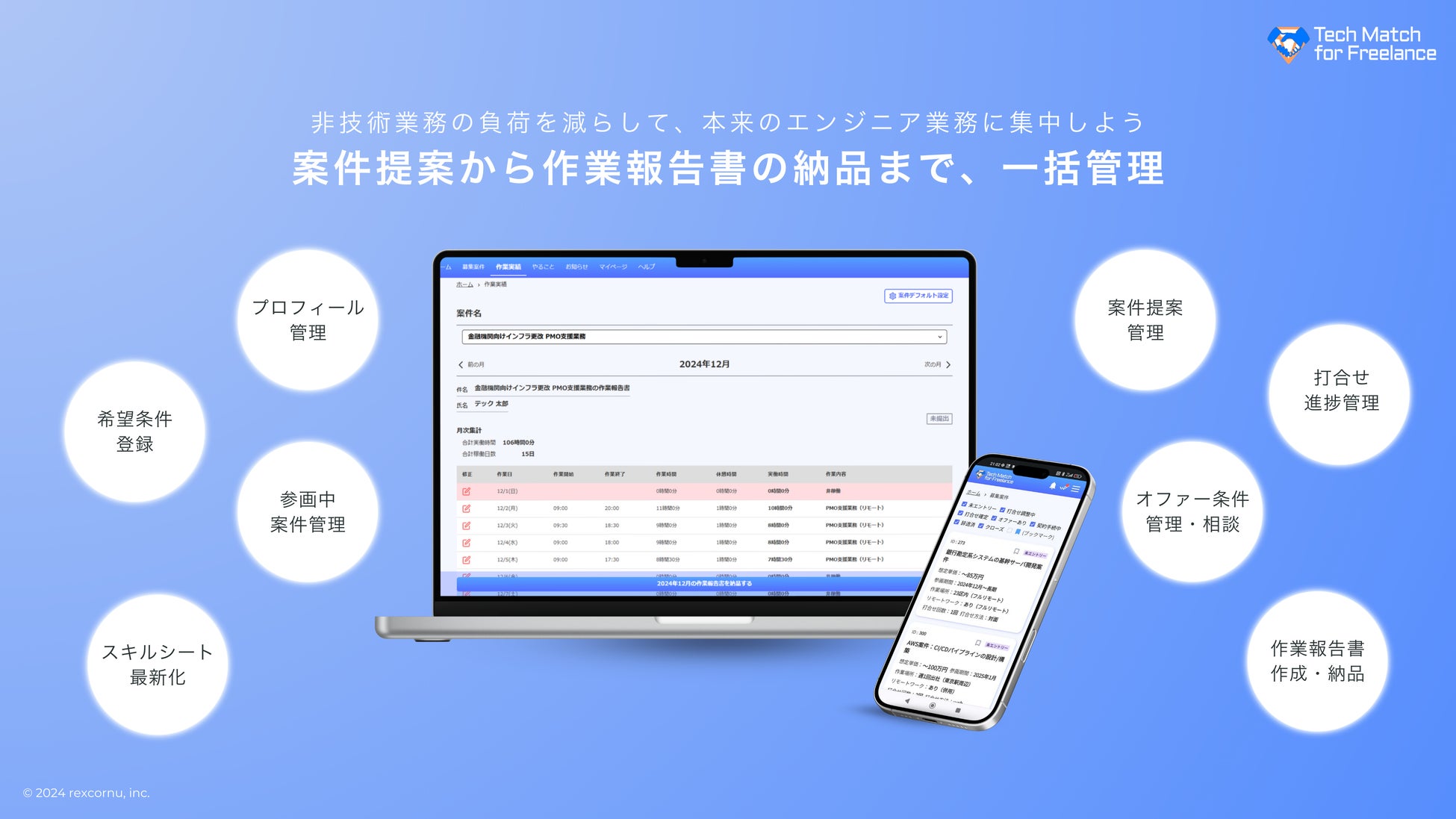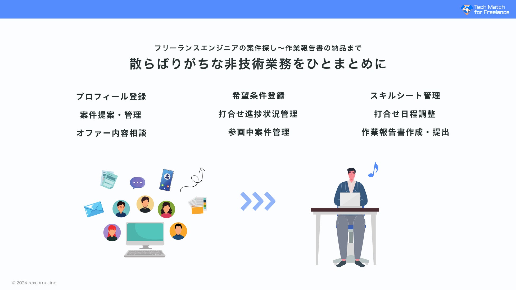 こうした背景を受け、rexcornuは案件提案から納品物作成・提出までをワンストップで管理できる、「TechMatch for Freelance」をリリースすることといたしました。