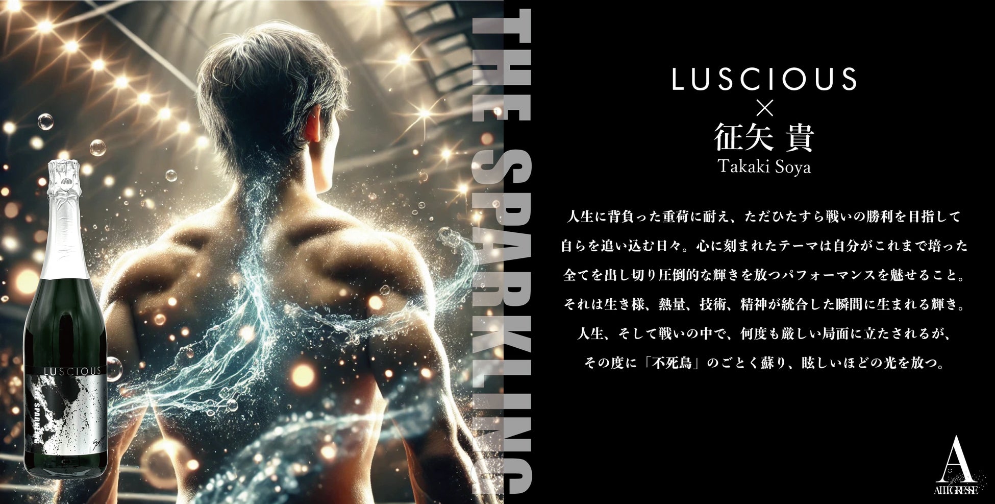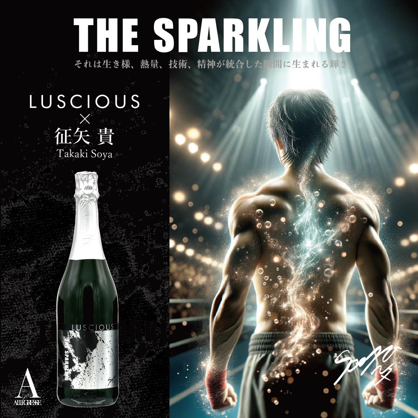 株式会社アレグレス(東京都渋谷区渋谷2-6-11 花門ビル2F 代表取締役 稲垣則良 TEL:03-6427-7406)は、自社オリジナルブランドである「ラシャス」とスポンサー契約をしている総合格闘家 征矢貴(THE BLACKBELT JAPAN所属)とコレボレーション商品「THE SPARKLING」(ノンアルコールスパークリングワイン)を開発しました。2024.7.28 超RIZIN.3に征矢貴 vs. ジョン・ドッドソンがベアナックルルールで対戦決定したため、応援の気持ちをこめて数量限定のノンアルコールスパークリングを発売します。2024年7月3日より自社オンラインストア「アレグレスオンライン」及びAmazonにて発売致します。ランダムにサイン入りの商品があります、お楽しみに!
