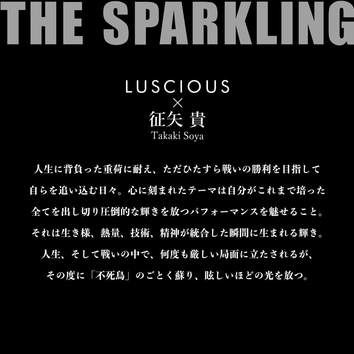 戦国時代、戦前に武将達が宴を開き、仲間たちと共に、戦い前の気持ちと覚悟を高めた「出陣式」のように、ぜひ、それぞれの闘いの前にはTHE SPARKLING を飲んで、自分自身の気持ちを鼓舞してください。みんなで征矢選手を応援しましょう。