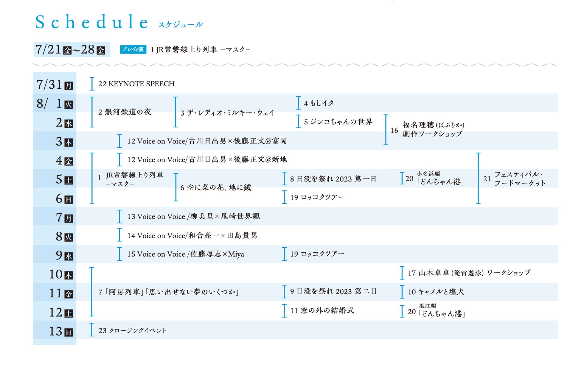 途切れ途切れになってしまった地域と、そこに住む、そこに住んでいた人々の心を、物語の力で、少しずつつないでいければと願っています。唱歌「汽車」の一節、「闇を通って広野原」の通り、長い闇を抜けて言葉の光が差し込むような演劇祭になればと思います。