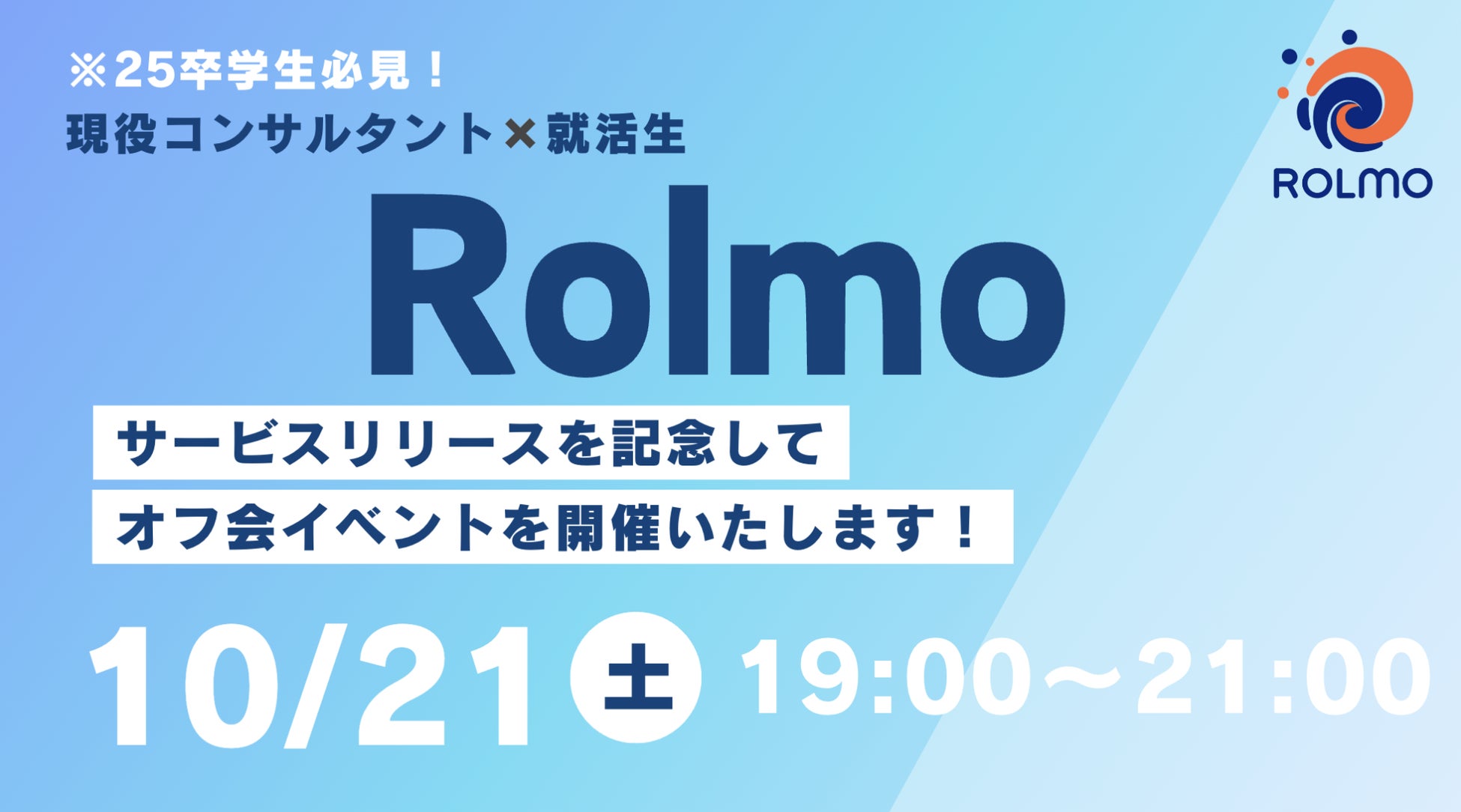 2023年4月から25卒学生を対象に採用直結のインターンシップが解禁され、就職活動の早期化が進んでいます。またこの秋にコンサルティング業界の就職活動解禁も予定されています。それに伴い、当社では、Rolmoを通じてコンサルティング業界を目指す学生と現役で活躍するプロフェッショナルなコンサルタントの相談マッチングのオフ会を開催する運びとなりました。本イベントでは、就活生のお悩み相談や面接の直前対策などにご活用いただけます。