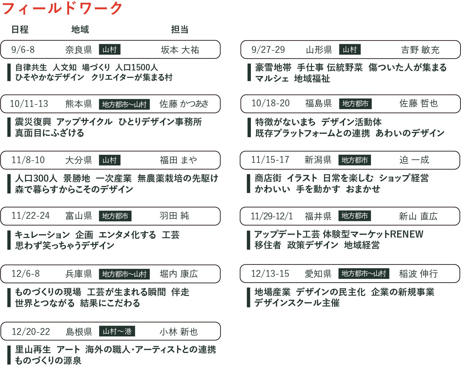参画デザイナーの拠点地域に3日間滞在します。関わる仕事やプロジェクトを見たり、その土地の伝統や文化に触れたり、そこに暮らす方々のお話を聞いたり。地域からの信頼ある彼ら彼女らだからこそ、普段はなかなか聞けないお話や訪問先が盛りだくさんの内容です。
