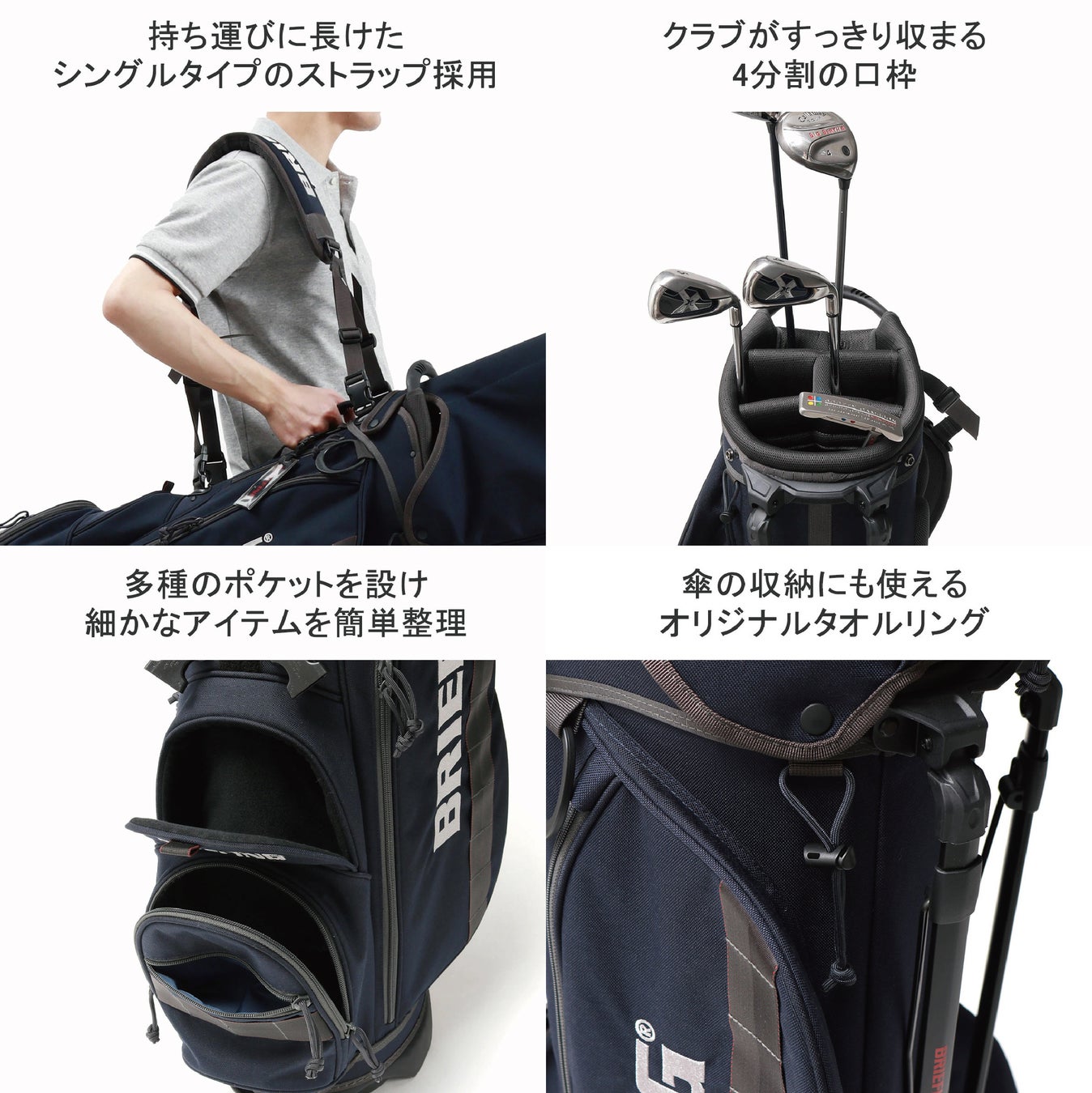 収納部は4分割でセパレートされており、クラブ同士が絡まずスムーズに取り出せる設計。外側には冷えたドリンクボトルを収納できる保冷機能付きポケットや、ラウンドで使用する細かなアイテムをすっき管理できる、多彩なポケットが充実しています。ストラップはシングルタイプを採用。担いでコースを周る場面が少ないカートでのラウンドでは持ち運びし易い仕様です。デザイン・機能性共に優れた頼もしいアイテムに仕上がっています。