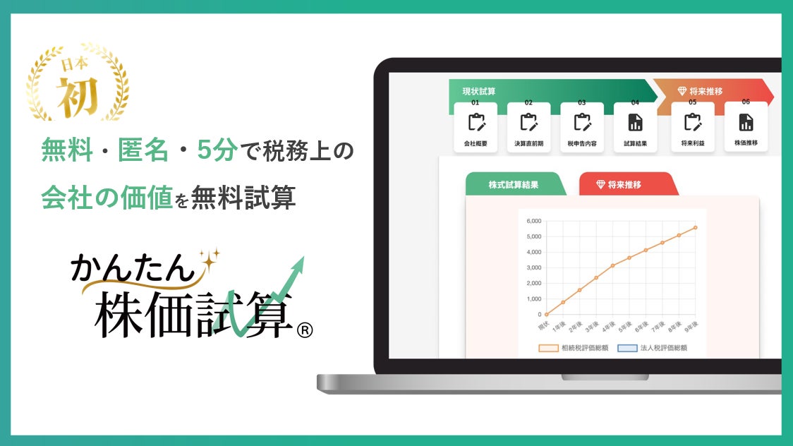 「かんたん株価試算」は、昨今の深刻な事業承継問題の解決に寄与する中小企業経営者向けのWebサービスで、経営者・財務担当者・税理士・金融機関などすでに多くの方にご利用いただいており、リリースからわずか1か月半で試算件数が500件を突破するなど、その需要の高さを示しています。
