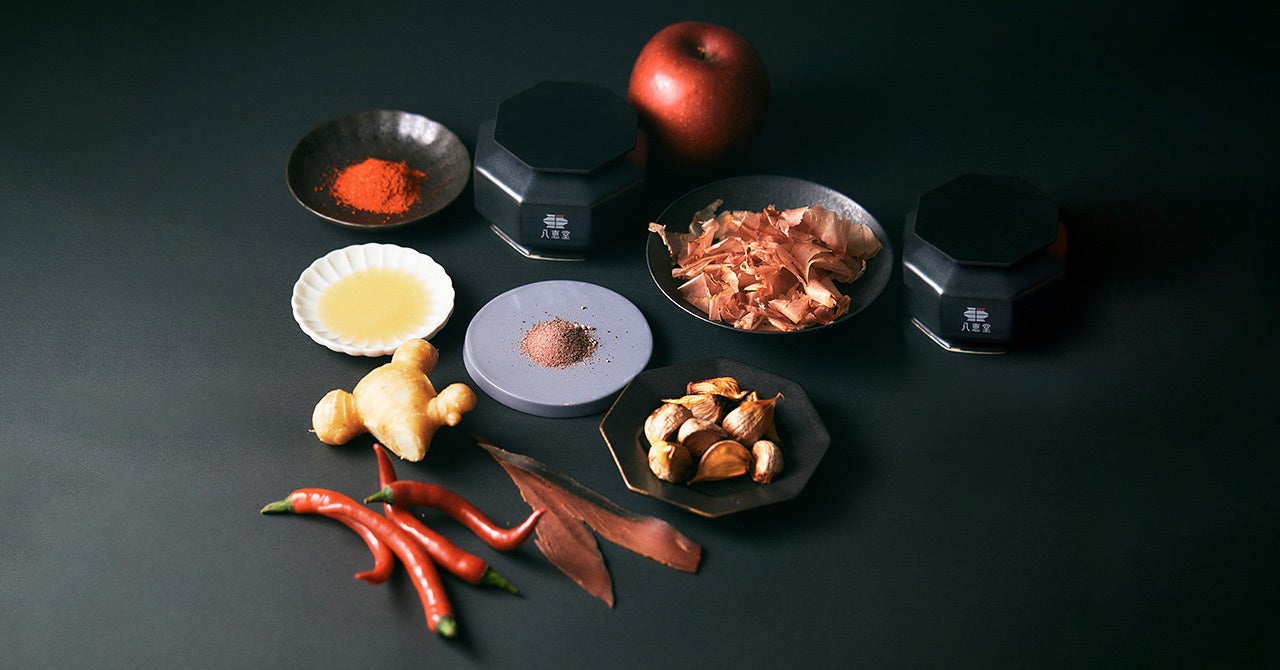 大山の唐辛子、熟成黒にんにく、ヒマラヤの紫岩塩、アカシヤの生蜂蜜、焼津市の手火山式鰹節、高知で長年かけて開発された黄金生姜、奄美大島のキビ糖と北海道のてんさい糖、日本一の生産量を誇る青森のりんご果汁の8つの厳選したこだわりの素材を使っています。