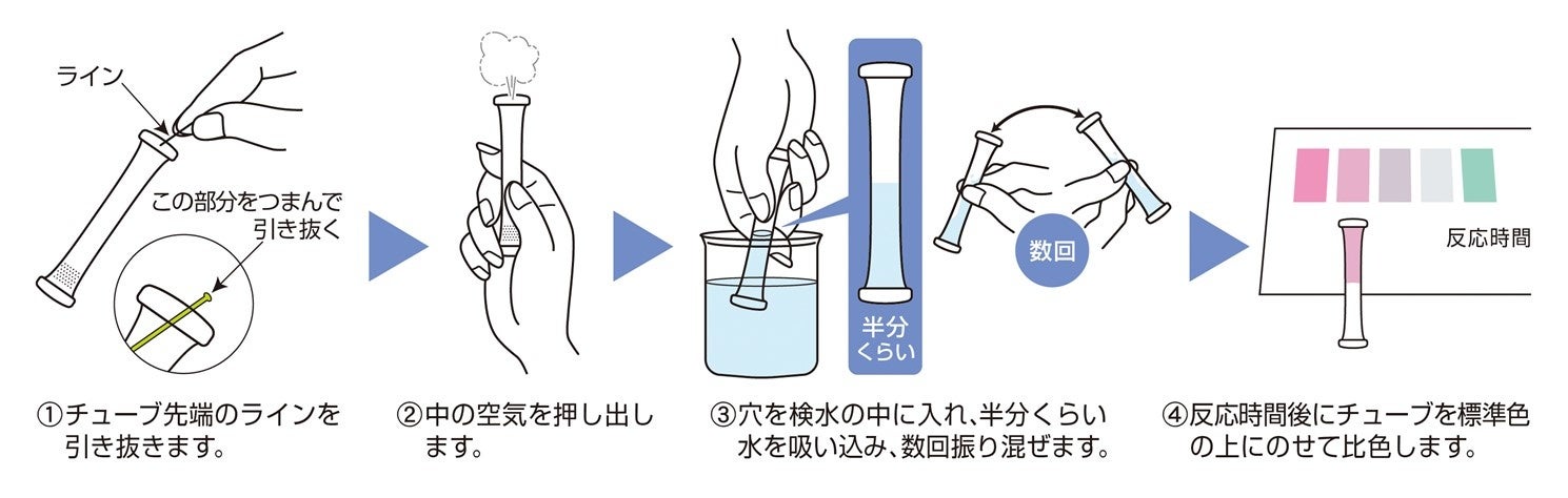 試薬が入ったチューブに検水を吸い込み、反応時間後に吸い込んだ水の発色を標準色と比べることで、水質を測定できます。