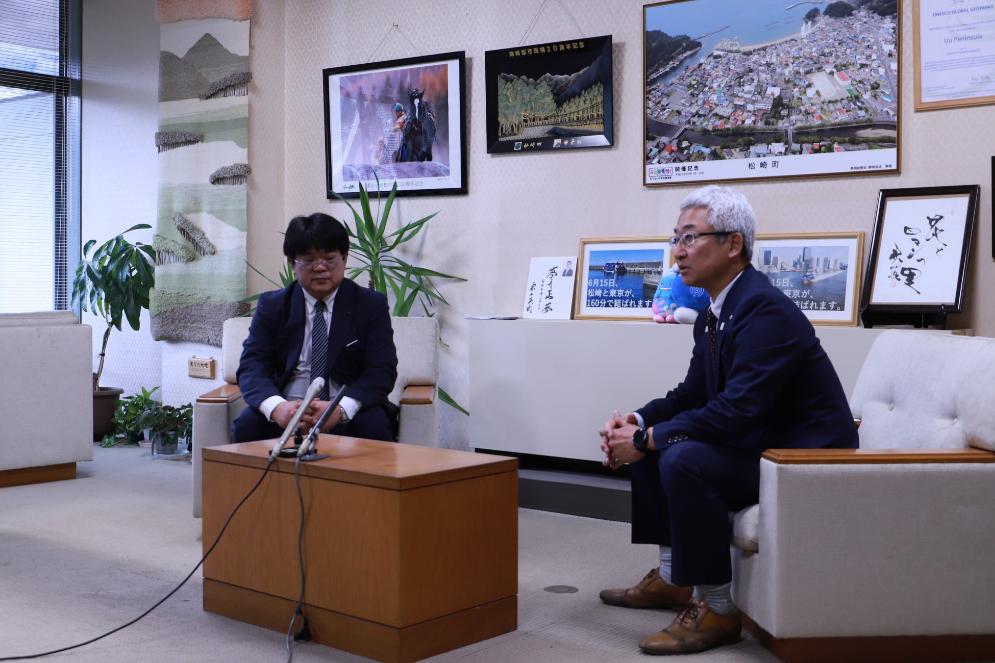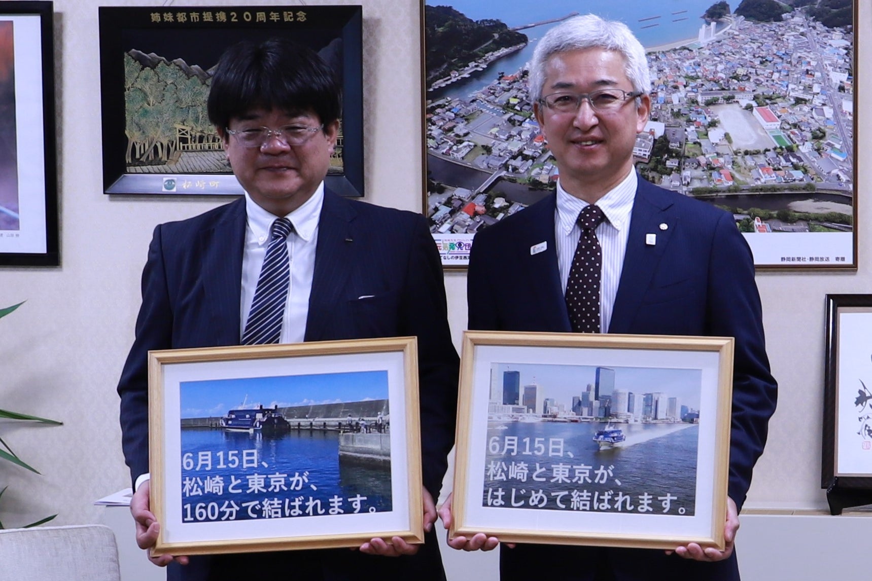 令和3年に、町長になった後も、松崎新港をどう地域発展に活かしていくべきか、議論を続けてきました。松崎新港は沼津港と共に特定地域振興重要港湾に指定されておりますが、鉄道がなく公共交通が脆弱である西伊豆松崎町にとって、海上からの船でのアクセスは、コロナ禍からの観光復活になくてはならない重要な交通手段であると考えています。令和の風待ち港として、今回、松崎と東京都心が歴史上初めて直接結ばれることが、観光復活の狼煙となることを期待しています。