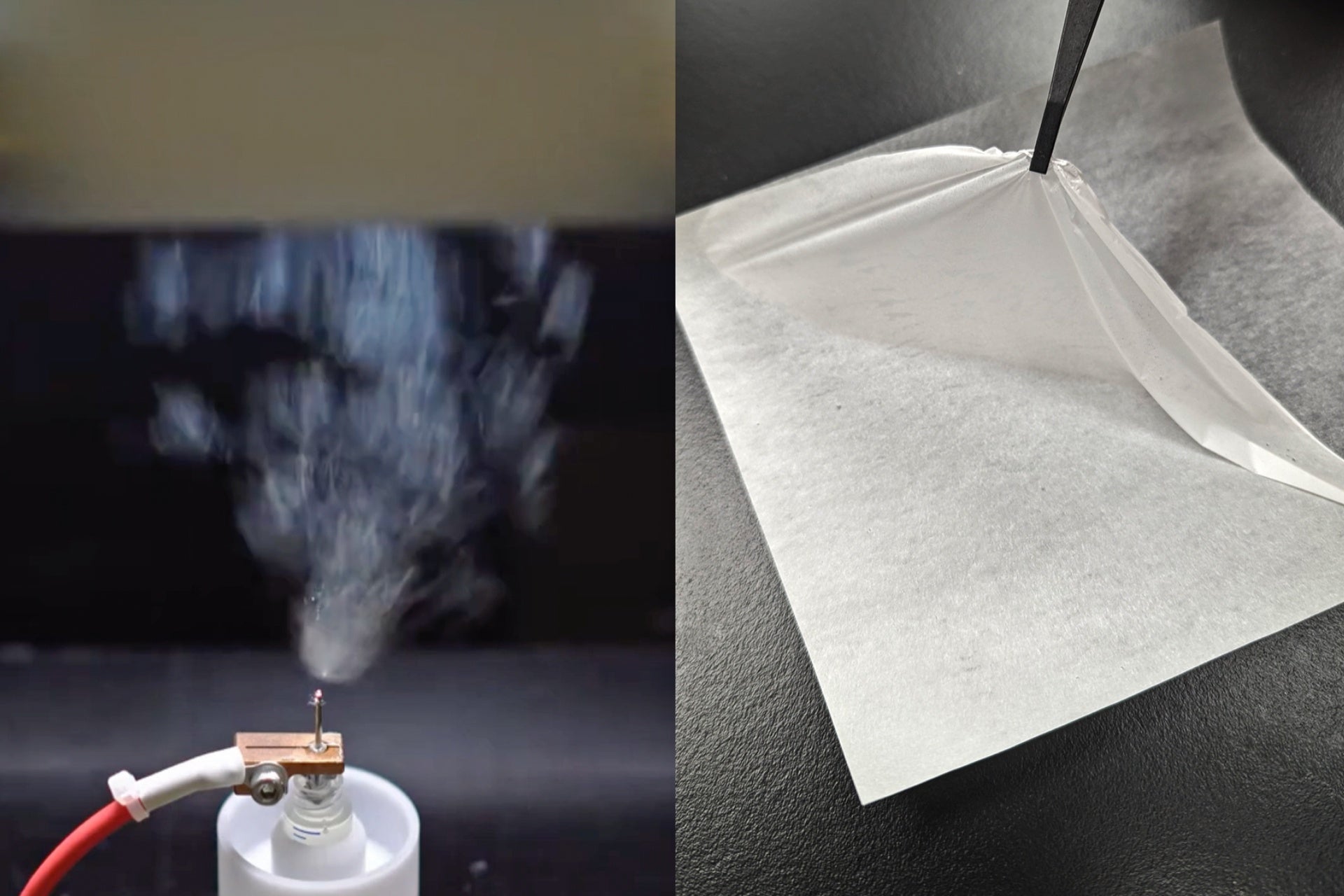 写真:(左)エレクトロスピニング法でナノファイバーを作製している様子、(右)作製したPU/PEO複合ナノファイバーシート
