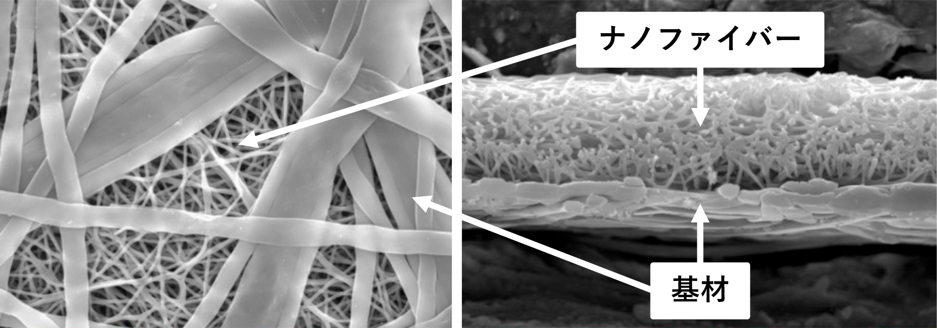 エレクトロスピニング法で製造した超微細な繊維「ナノファイバー」素材が注目されています。ナノファイバーはその特性からさまざまな産業での応用が考えられますが、これまでの製造技術で作られたナノファイバーは、汎用的な化学薬品に溶解してしまったり、120〜130℃以上の高温に対して安定していなかったりと、いくつかの弱点がありました。例えば、PU(ポリウレタン)ナノファイバーは、透湿防水膜やフィルタ等の産業分野で実用化されている高機能繊維材料です。しかし、化学安定性や熱安定性が課題となり用途が限定され、期待されているほどの市場拡大には至っていませんでした。