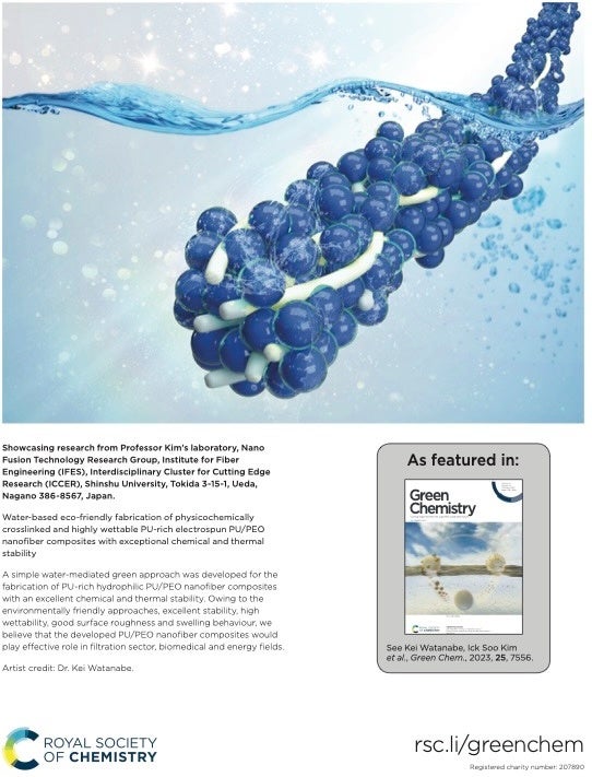 タイトル | Water-based eco-friendly fabrication of physicochemically crosslinked and highly wettable PU-rich electrospun PU/PEO nanofiber composites with exceptional chemical and thermal stability(物理化学的な架橋構造により優れた化学的・熱的安定性を実現したPU高含有率の親水性PU /PEO複合エレクトロスパンナノファイバー材料およびその環境に優しい水系製造プロセス) |