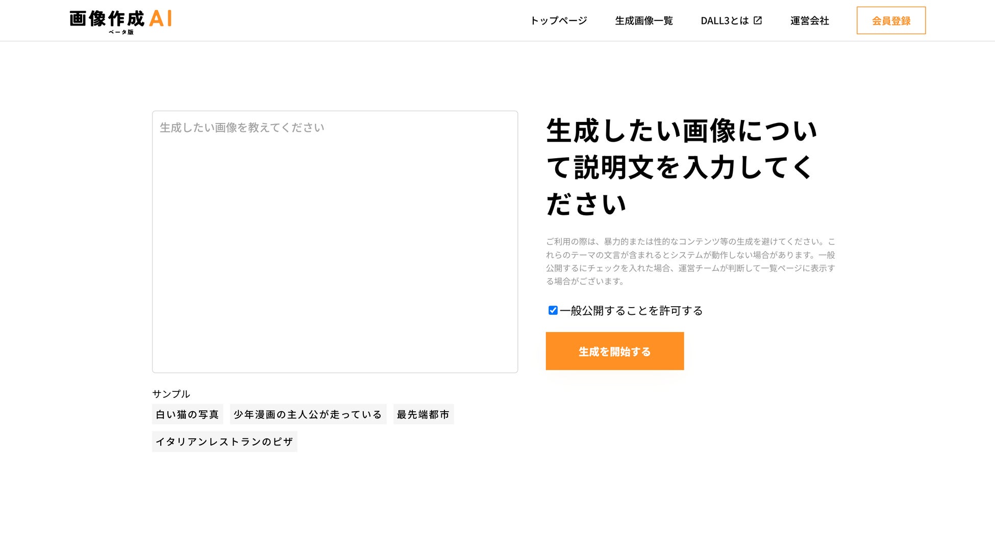 トップページ、画像作成がメインページになり、文字入力してボタンをクリックすると画像生成が開始されます。