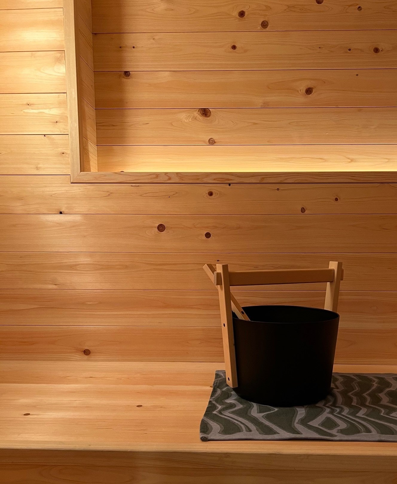 ・全面ヒノキを使用した、心地よい香りのサウナ室内