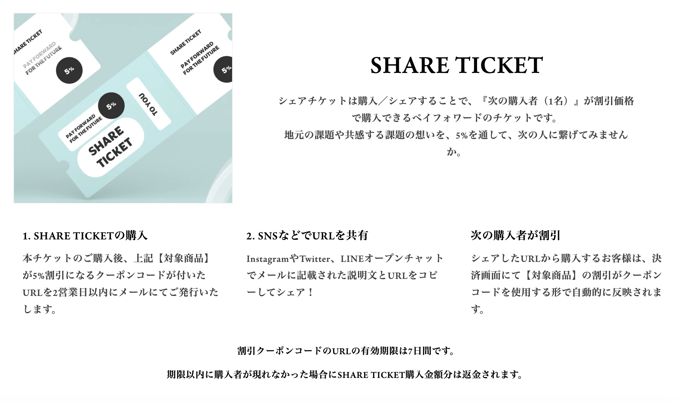 自分自身が共感するブランドや、地域課題の取り組みを行うブランドでの商品購入していただけます。また、購入を通して感じた気持ちや自分自身の価値観をSNSで気軽にシェアができるチケットの購入をしていただけます。