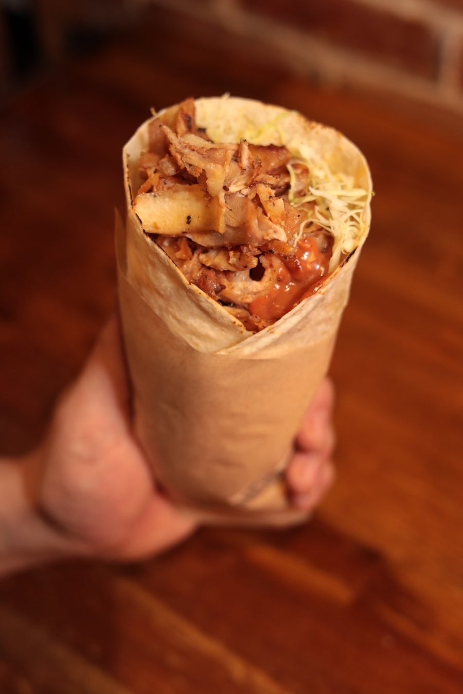 ピタパンやチャパティ(全粒粉と水を捏ねて生地を作り、発酵させずに薄い円形にのばして焼いたものである)とケバブチキン、キャベツ、ソースの一体感を味わえます。