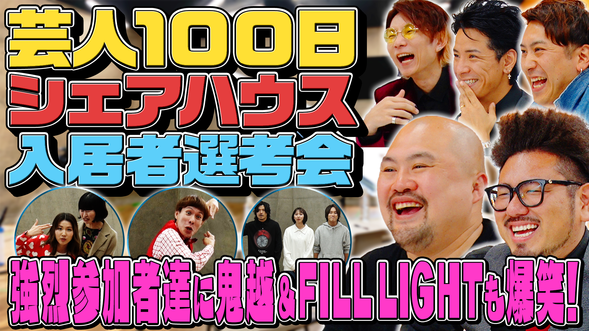 初回はシェアハウスの入居者を決めるため、芸歴10年目以下の若手芸人のオーディションを開催。総勢16組の中から、MCの鬼越トマホーク、FiLL's TVメンバーと、スタッフによって、“夢”と“情熱”を持った若手芸人4組を選考します。