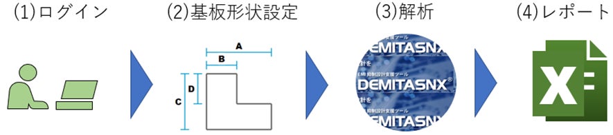 本サービスは、会員登録無料の北川工業のWebサイトにログインし、基板サイズを入力することで、北川工業製オンボードコンタクトOG(注1)部品によるノイズ対策効果を、NECソリューションイノベータのEMCノイズ対策システム「DEMITASNX」(注2)により可視化し、オンボードコンタクトOGの部品選定・設置位置・個数による効果をまとめたレポートを入手できるものです。