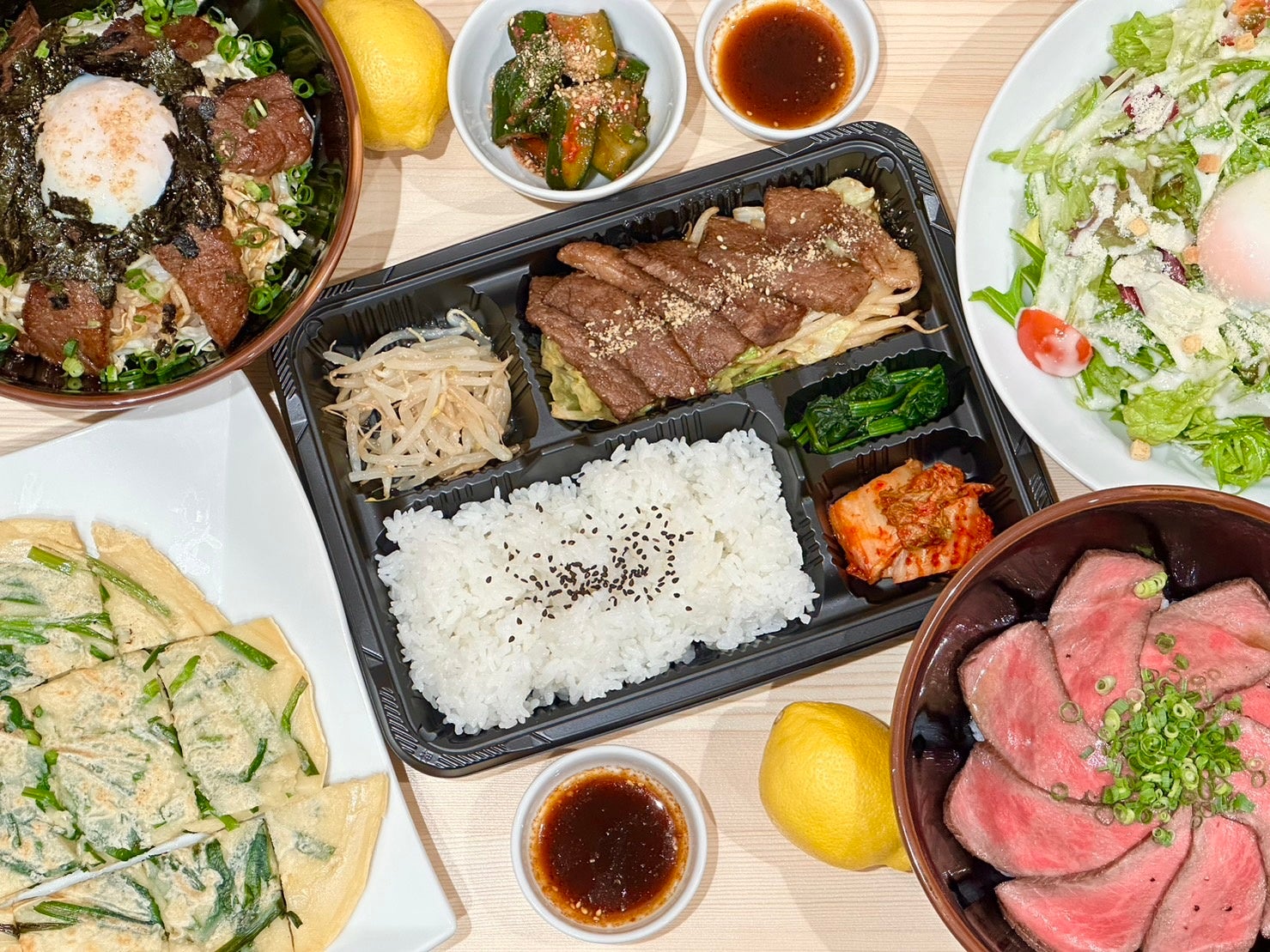 タレ焼肉弁当800円やカルビ丼1000円などコスパ最高のテイクアウトメニューのなかでも最も人気なのがこちらの”ハラミステーキ弁当”1600円(税込)。柔らかく食べやすいハラミをレアに焼きジャポネソースで仕上げた絶品のお弁当。テイクアウト商品はご飯の大盛りが無料でご注文いただけます。