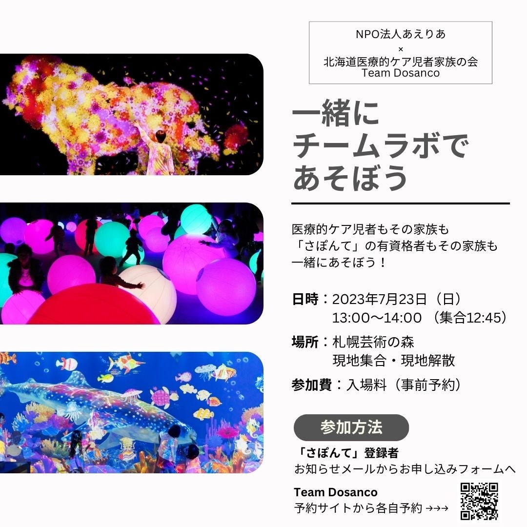 2021年に「医療的ケア児支援法」が施行され、行政、保育園、幼稚園、学校では、医療的ケア児を受け入れられる体制づくりが進められています。在宅で暮らす医療的ケア児者は増えており、インクルーシブな社会のためには、大人も子どもも医療的ケア児者との接点を多くもつことも重要です。接点づくりとして、NPO法人あえりあと北海道医療的ケア児者家族の会Team Dosancoのコラボで、札幌芸術の森に来るチームラボで一緒にあそぶ機会を企画しました。