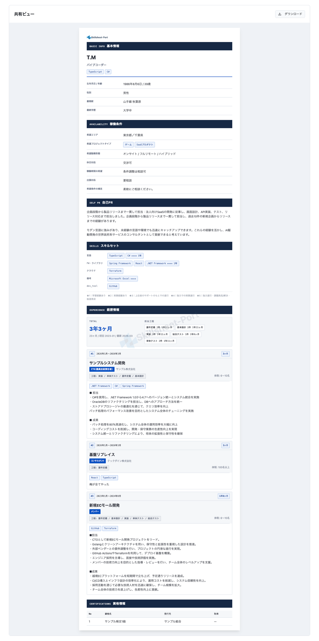 氏名・連絡先を伏せた状態でスキルシートを共有可能。エージェント経由の提出など、個人情報を出したくない場面に対応します。