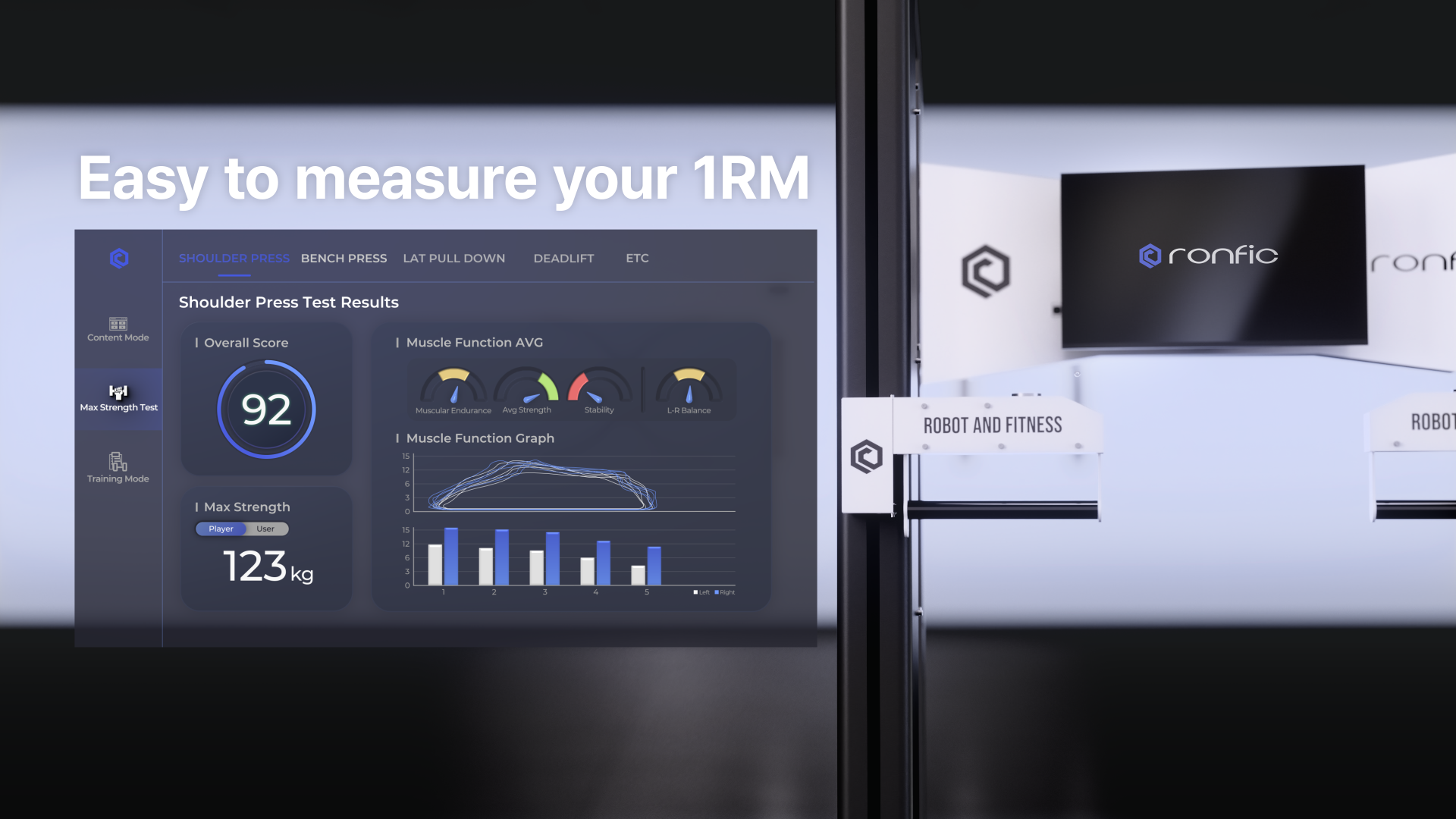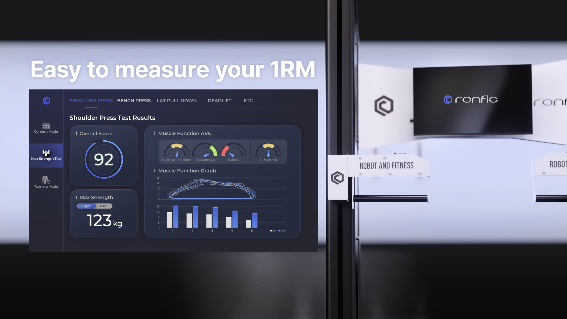 RONFICは、AIとロボット技術を融合した次世代型スマートフィットネスマシンです。従来の「重さを持ち上げる」筋トレとは異なり、筋力・スピード・パワーなどの身体能力をリアルタイムで測定・可視化し、個々のユーザーに最適なトレーニングを提供します。