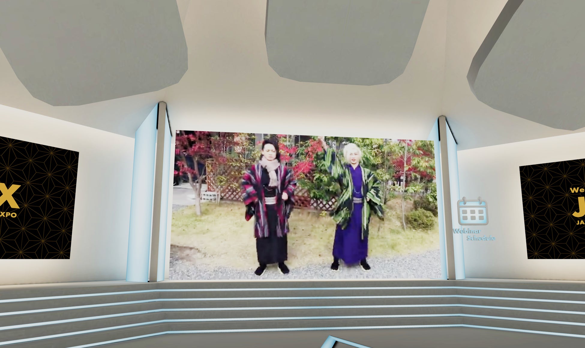 JVREXは月と地球の間に浮かぶ宇宙ステーション型イベント会場をモチーフとしたメタバース展示空間です。Cool Japanを体感していただくために、日本の食の展示のみならず、文化・芸能・音楽・観光などさまざまな動画をサイネージ上で配信しています。