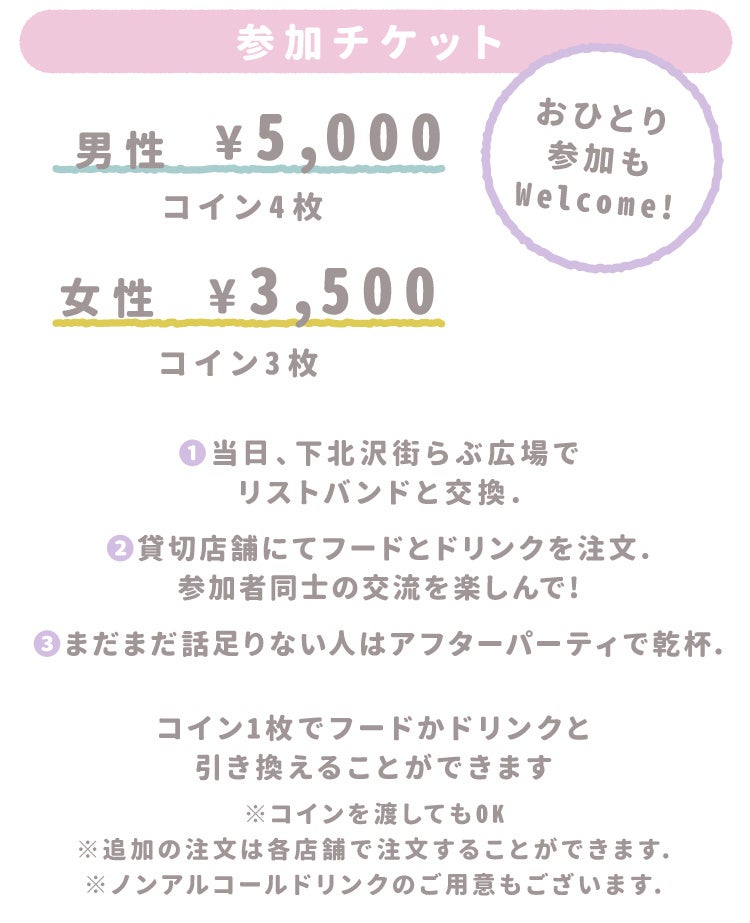 参加費用:男性5,000円(店舗で使えるコイン4枚付)