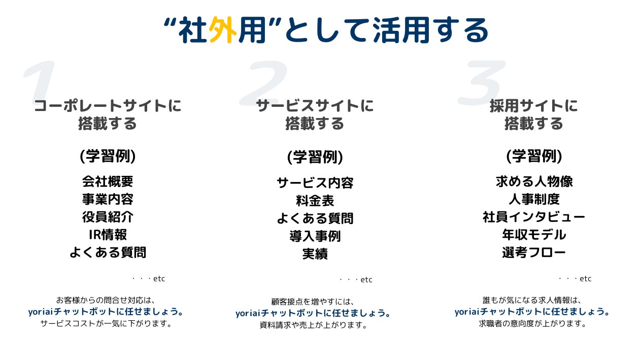 進化したyoriaiチャットボットを導入いただく事業主様には、コミュニケーションコストの軽減と効果的なコスト削減を提供し、より企業の事業運営に貢献したいと考えております。