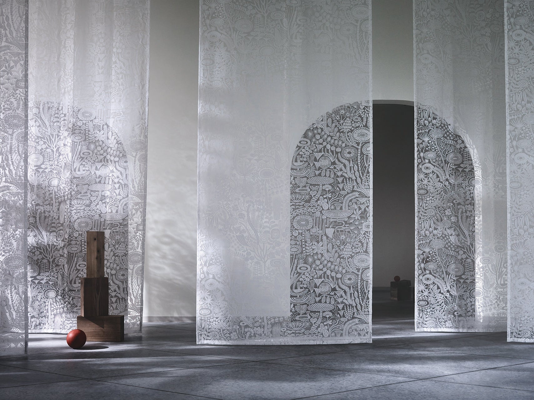 生命力あふれる多様な植物を、埋め尽くすように細密に描いた透け感のあるカーテン。自然豊かな環境にある私たちのアトリエは、身近に植物が溢れ、呼吸をするようにモチーフを描いてゆきます。身近な野山に自生する植物を描き、光が射し込むとシルエットが影絵のように壁や床に映ります。Entrance(Spiral 1F)では、ウインドウの一部で展示致します。