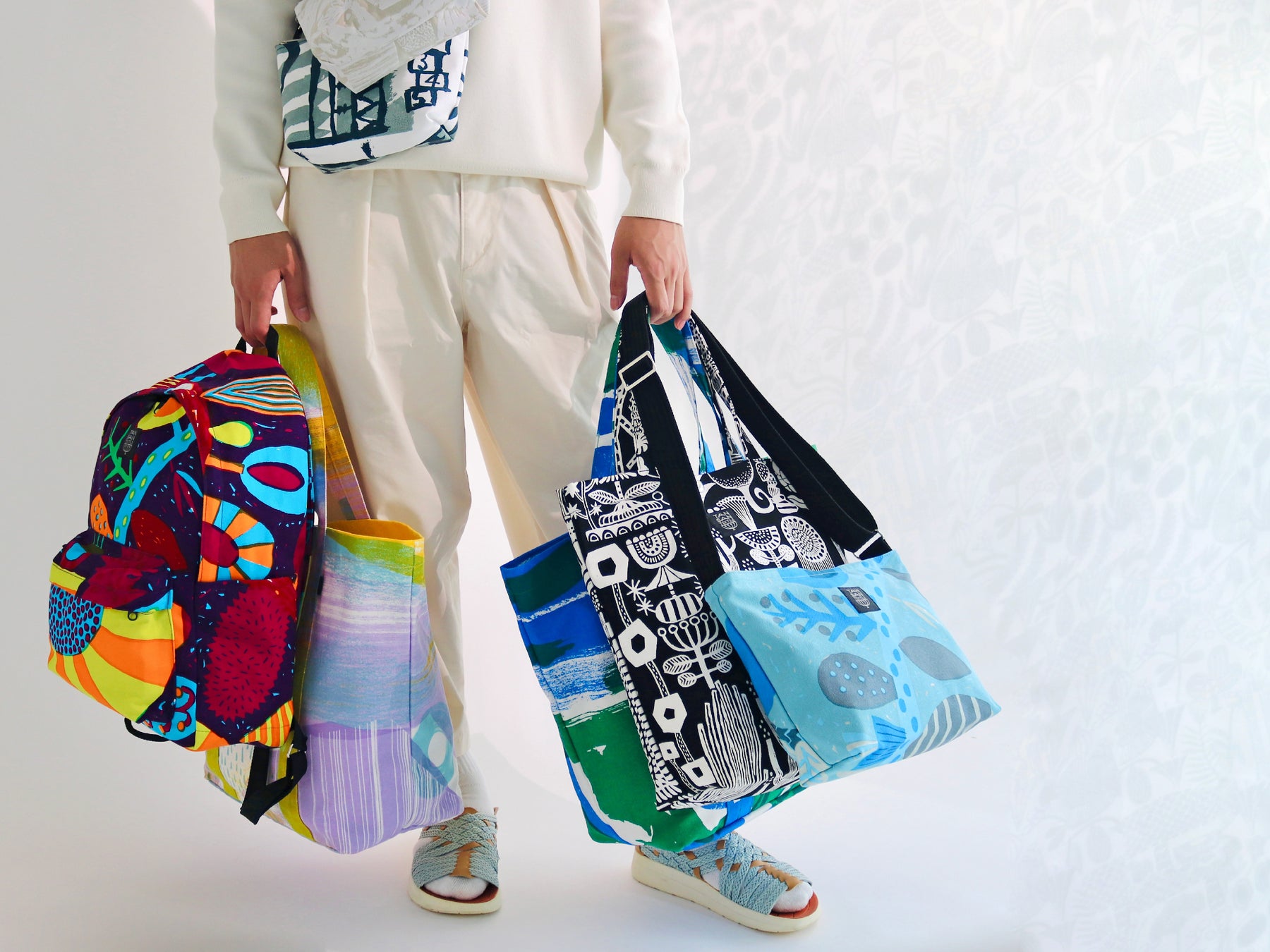 鮮やかな記憶を描き続け、国産の帆布を使用し、オリジナルのプリントテキスタイルを生み出し続けている炭酸デザイン室。職人のシルクスクリーンプリントによる、様々な柄や色彩のバッグやポーチ。ぜひお好みのテキスタイルを見つけてください。Entoranceの大きな壁一面には、大きな植物が力強く描かれたWhOとの壁紙「南の植物」や、自生する植物を描いたフジエテキスタイルとのカーテン「ナティフ」が空間を柔らかく仕切ります。また、展示にはオトニシズムによる”炭酸デザイン室”をイメージした空間音楽が流れ、まるで炭酸の中にいるような体験ができます。