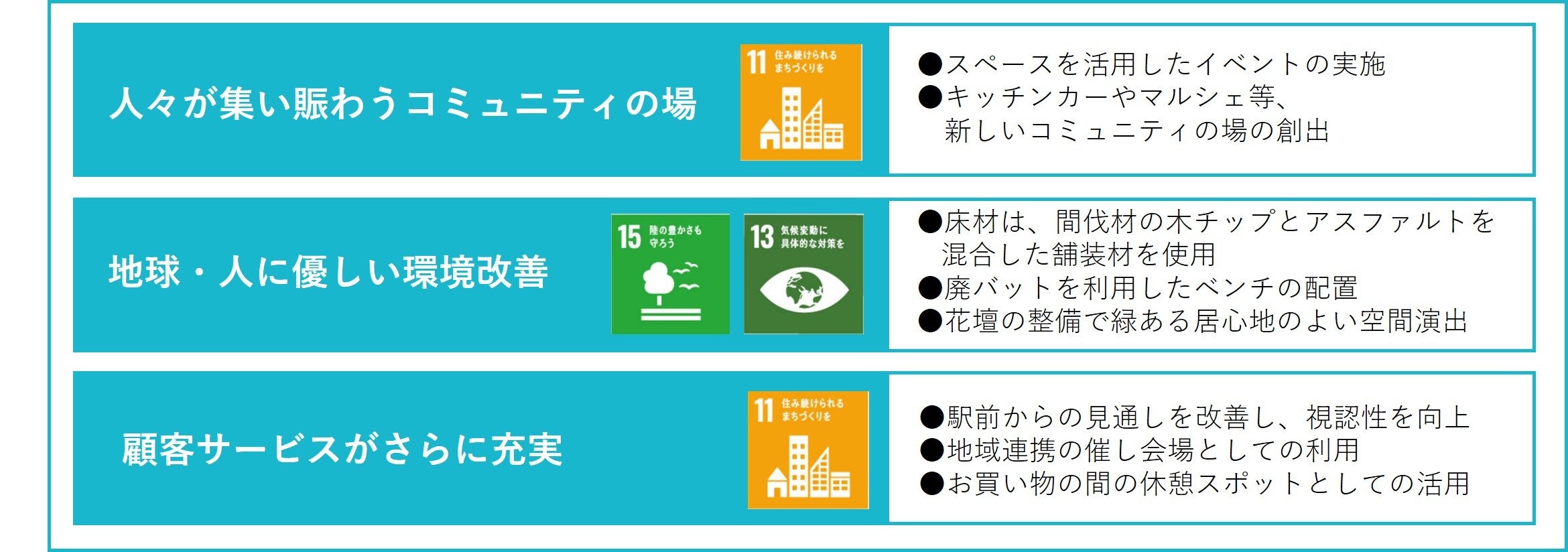 スペースの拡大だけではなくベンチの設置、自動販売機のラッピングを行うなど、お客様に楽しんでいただける空間を目指すとともに、リニューアル第1期の壁面緑化に続き、床材は間伐材の木チップを含んだ舗装材を使用するなど、環境や地域に配慮しました。