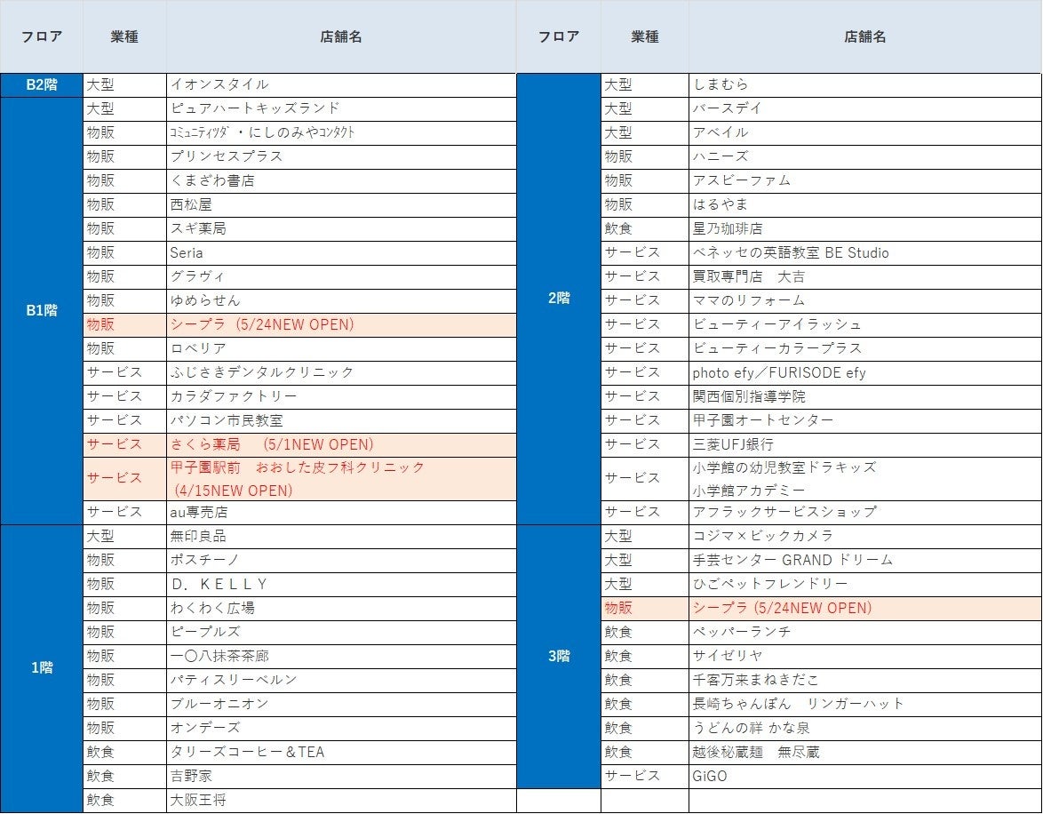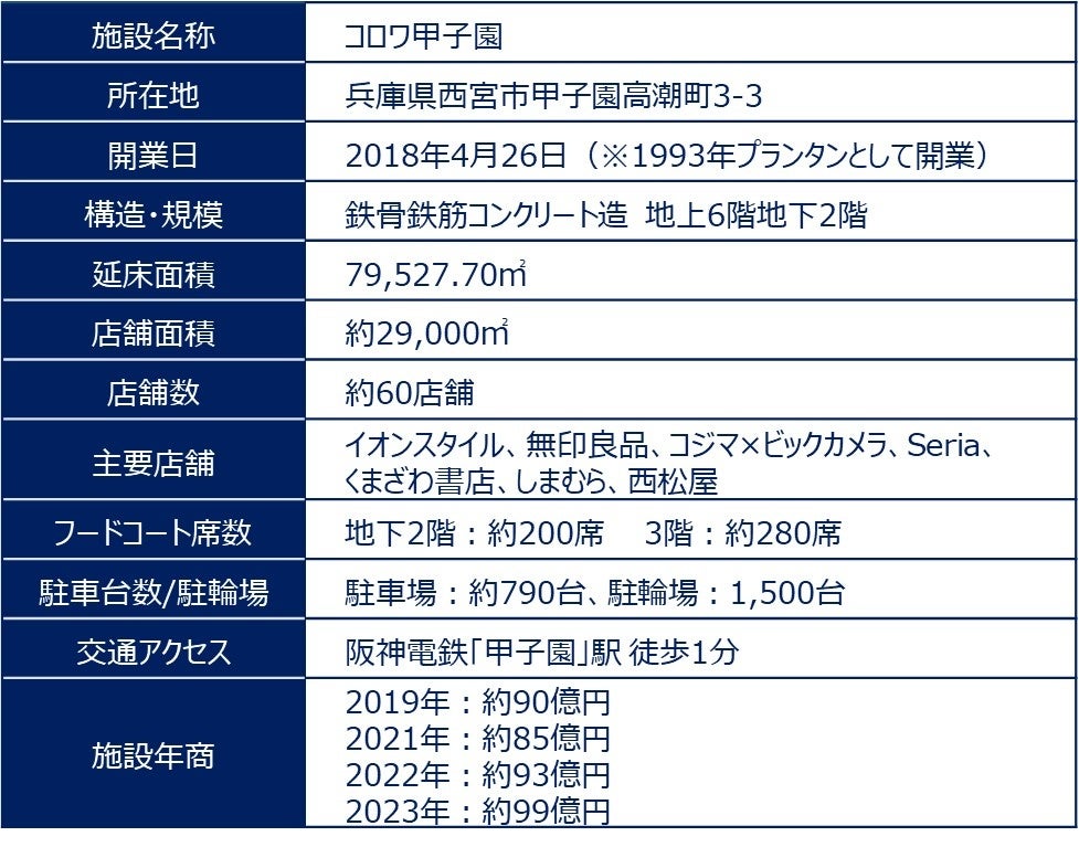 本施設は、駅前の利便性に優れ、敷地南側は「国道43号」を挟み「阪神タイガース」の本拠地「阪神甲子園球場」が隣接する、地下2階から3階まで(営業面積 約29, 000㎡)の店舗で構成される商業施設となります。