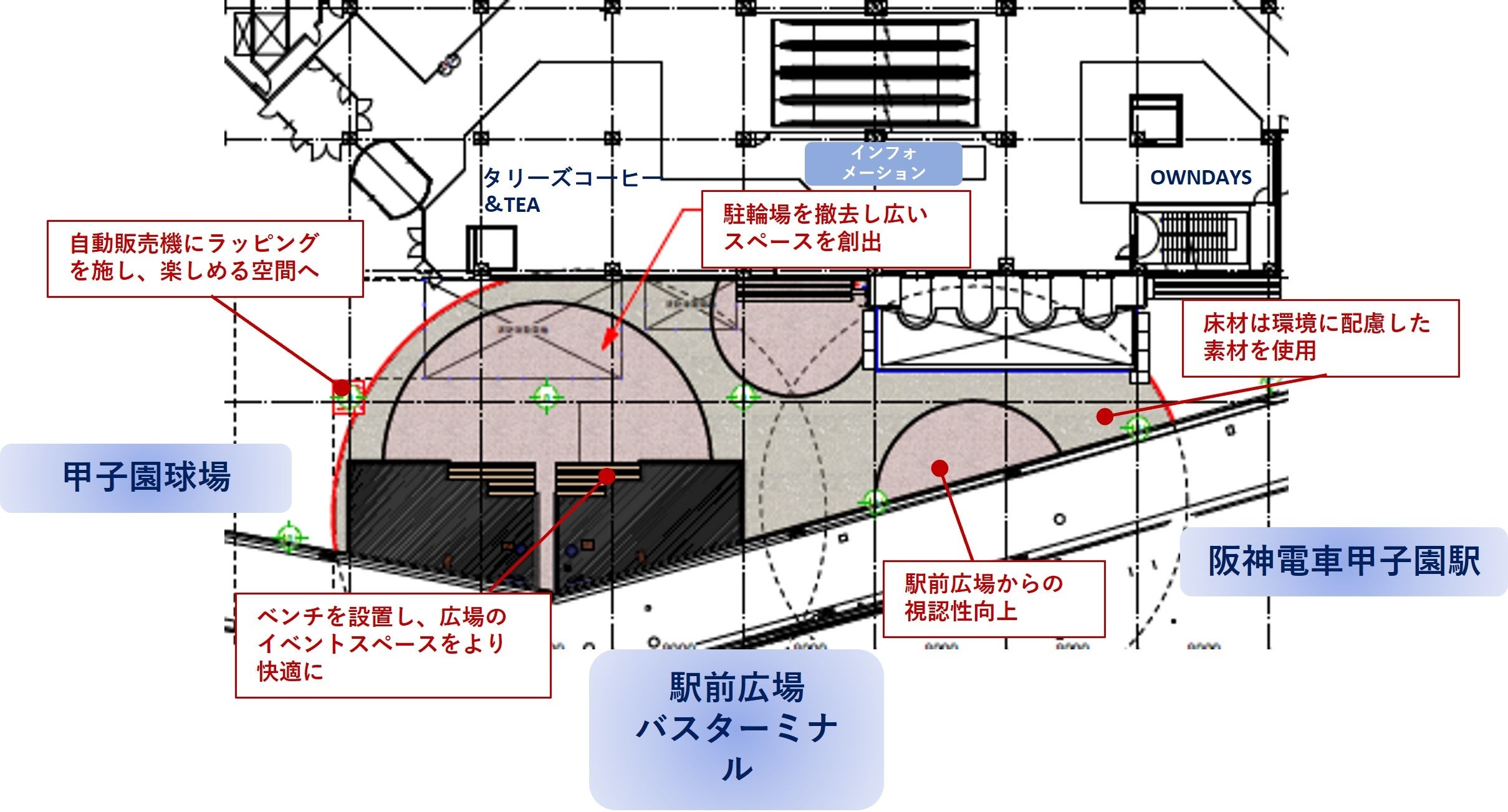 ●緑と茶色を基調とし、甲子園駅前広場と調和した空間へと生まれ変わります