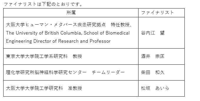 (3名、賞金 500万円、副賞 研究助成金4,000万円(5年間)、トロフィー)