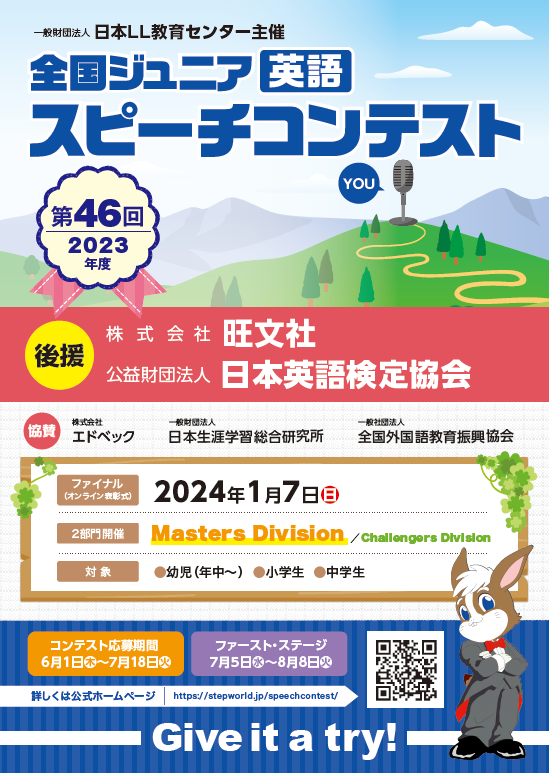 株式会社 旺文社、公益財団法人 日本英語検定協会のご後援のもと、子ども達の英語学習成果の発表の場として、昭和52年以来「全国ジュニア英語スピーチコンテスト」を開催、今年度で46回目を迎えます。